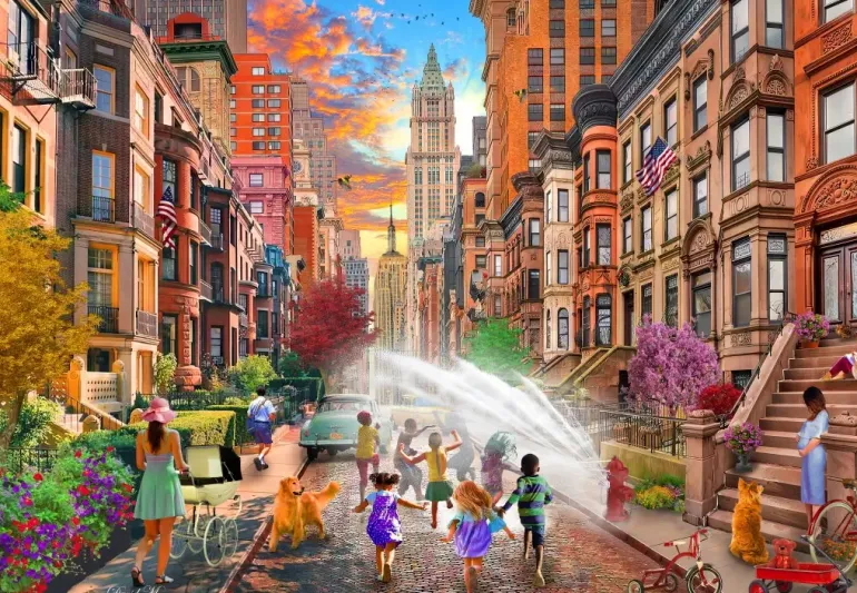 Det är en varm sommarkväll i en stad i USA. På en kullerstensgata leker kvarterets alla barn i en sprutande vattenpost. Motivet är kantat av vackra husfasader i sten, och i bakgrunden tornar landets kända skyskrapor upp sig mot en himmel med en gyllene solnedgång. Husen har blomsterplanteringar utanför portarna och några snygga veteranbilar skymtas på gatan och skvallrar om en svunnen tid. I motivet syns också människor som promenerar, läser och är ute med sina hundar. En härlig vardagsidyll skapat av den välrenommerade pusselillustratören David Maclean.
