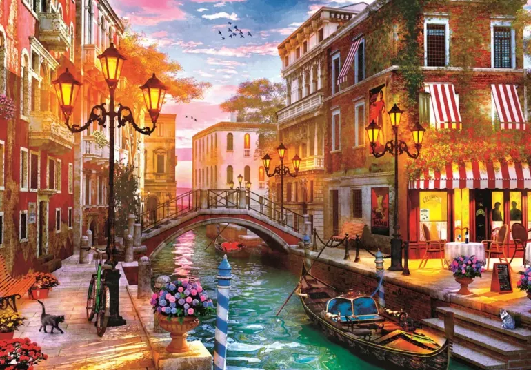 Här ser vi ett Venedig fyllt av romantik och som vilar i ett lugn, nästan inga människor syns ännu till och gondolerna ligger förtöjda. Solnedgången färgar himlen rosa, blommorna är praktfulla, gatlyktorna har precis tänts och restaurangerna är redo för kvällens första gäster. Motivet är skapat av den prisade konstnären Dominic Davison, vars konst är mycket populär i pusselformat.