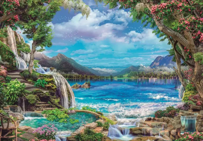 I det här praktfulla pusselmotivet på 2000 bitar, välkomnas vi till paradiset på jorden! Här flödar vattenfallen från klipporna, det finns en damm med näckrosors och Koifiskar, vattnet ligger turkosblått och klart framför blommande träd, och i bakgrunden syns skogar och höga berg mot den blå himlen full av vita fåglar.