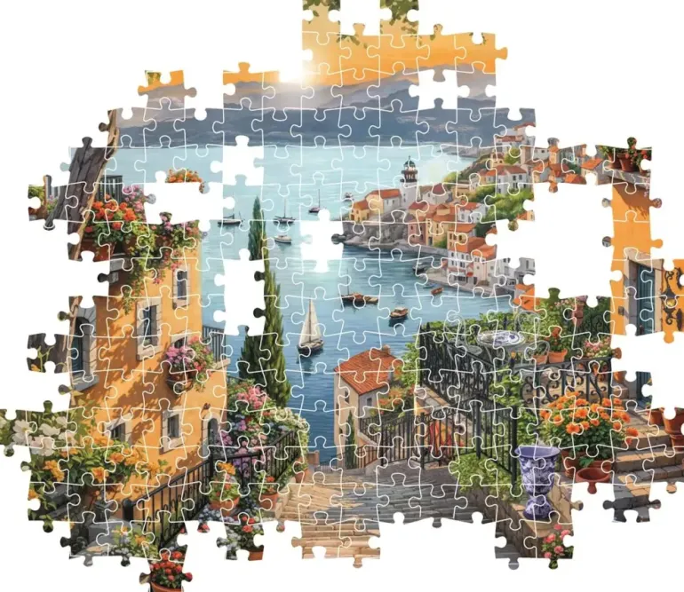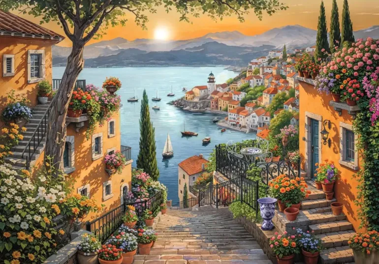 Det här pusselmotivet tar oss till toppen av en stentrappa, en solig dag, någonstans vid medelhavet. Utsikten är magnifik, vi kan blicka ut över vattnet och den lilla viken vid hamnen är full av segelbåtar. Vi skymtar staden inbäddad i bergen med vackra stenfasader och röda tak. På sidan av trappan syns gula hus med vackra blommor i glada färger och i horisonten syns bergstoppar och en mjuk solnedgång.