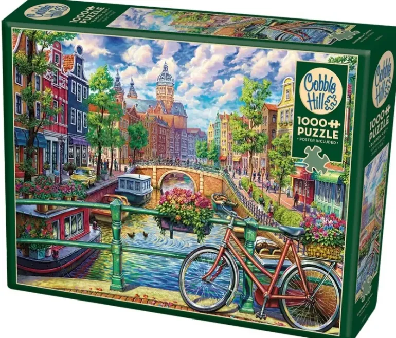 Ett klassiskt motiv från Amsterdam med stadens mest kända signum! På en av stadens broar står en cykel parkerad vid välfyllda blomsterlådor och med utsikt över den vackra staden. Längs med den lugna kanalen ligger husbåtar förtöjda och alléer och färggranna husfasader är vackert belysta av solen denna fina sommardag.