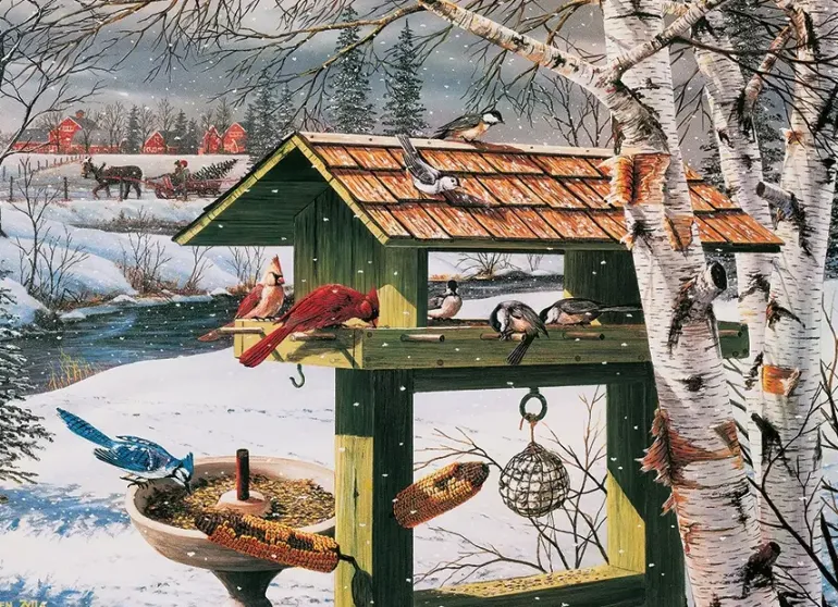 En lyxig helgmåltid för skogens alla fåglar! Blåskrikor, kardinaler och mesar har alla samlats vid fågelmataren för att äta frön och majs. Den gamla familjegården ligger i bakgrunden, och om du tittar noga kan du se en häst som dar en släde i bakgrunden. I släden sitter två personer som glatt ska åka hem med årets nyinköpta julgran.