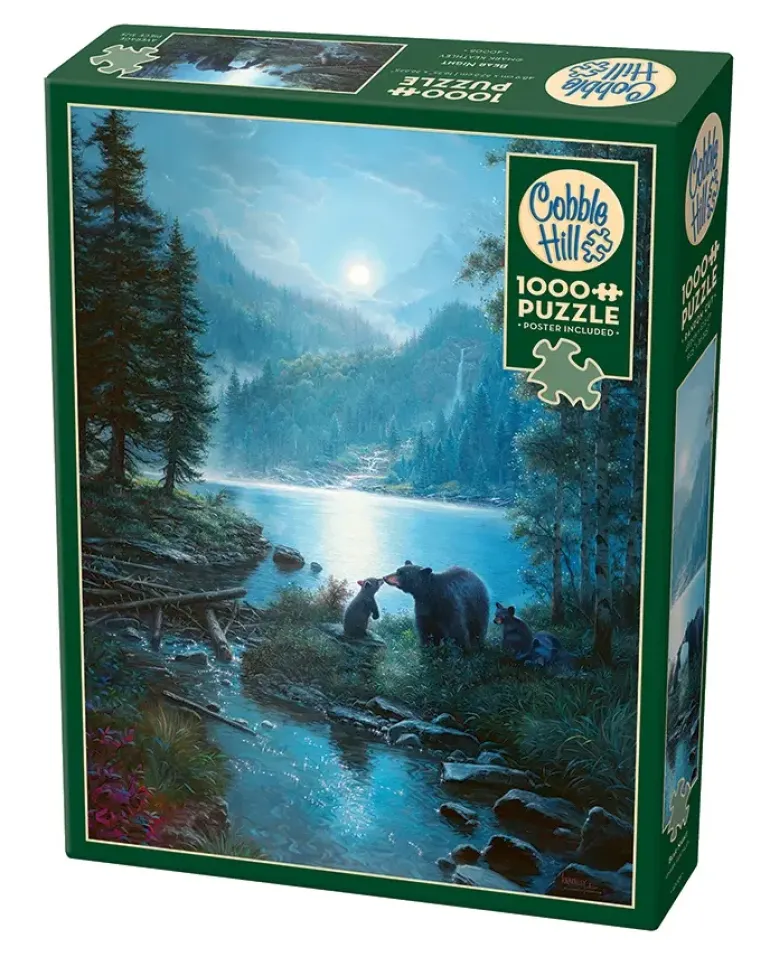 Här har en kärleksfull stund mellan en björnmamma och hennes ungar fångats i ett pusselmotiv. Björnarna har kommit ner från berget till en sjö som gnistrar i det magnifika månskenet.