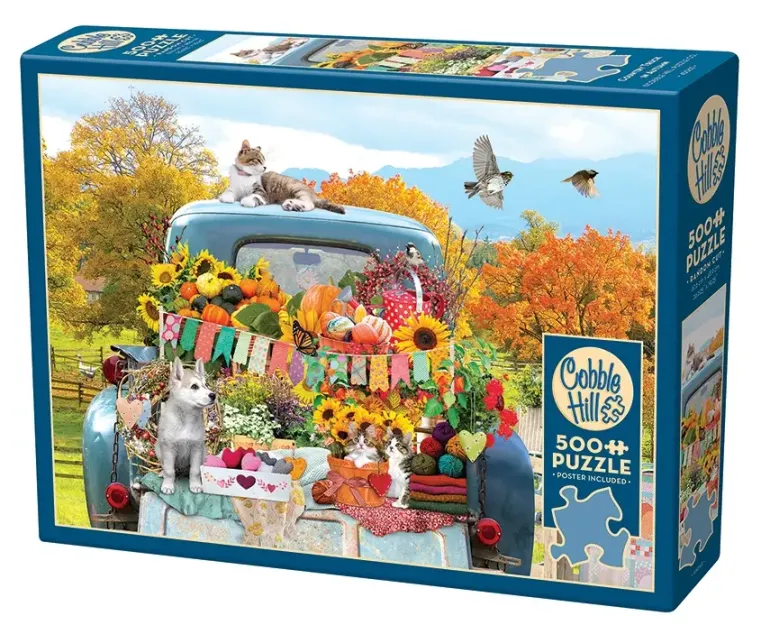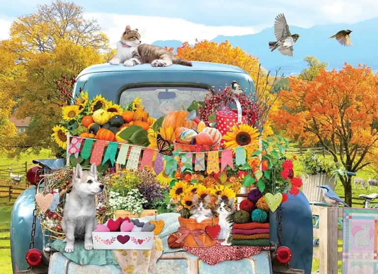 Vi är på väg till höstmarknaden med ett par trogna följeslagare och en lastbil full med pumpor, blommor och hantverk. I bakgrunden syns en klarblå himmel som utgör en fin kontrastfärg till trädens gula lövverk.