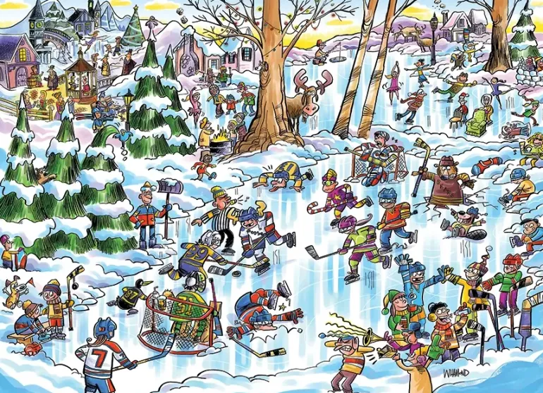 Idag är det full fart på isen, det är hockeymatch och byns invånare (och några av skogens djur) har samlats för att heja på sina favoritlag. Ett vintermotiv fullspäckat av humoristiska detaljer och vintriga aktiviteter.