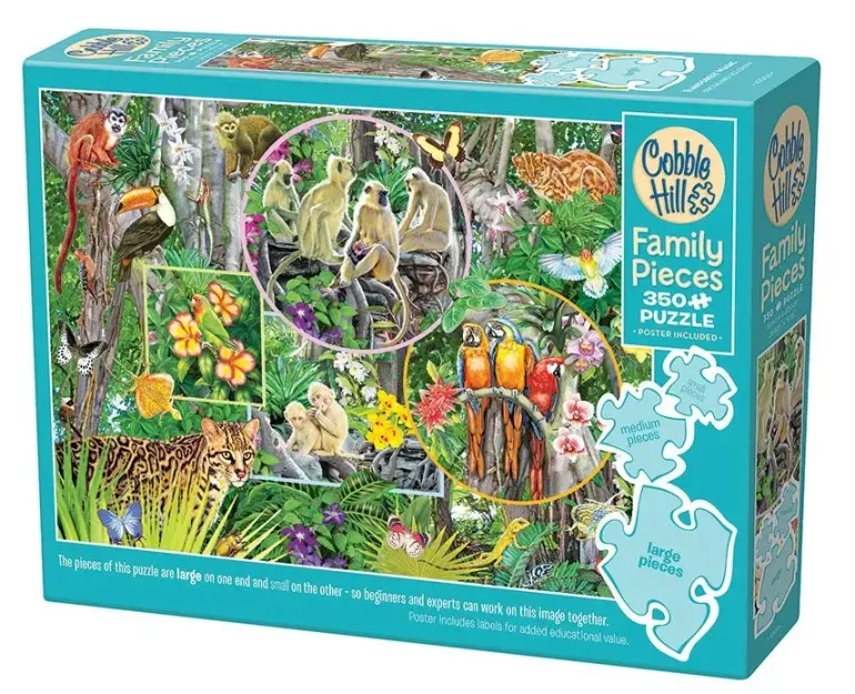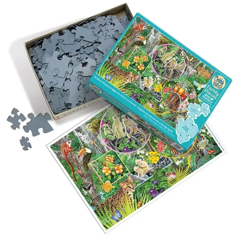 Det här är ett familjepussel, med olika stora bitar från vänster till höger i motivet, så att alla i familjen kan vara med och pussla!