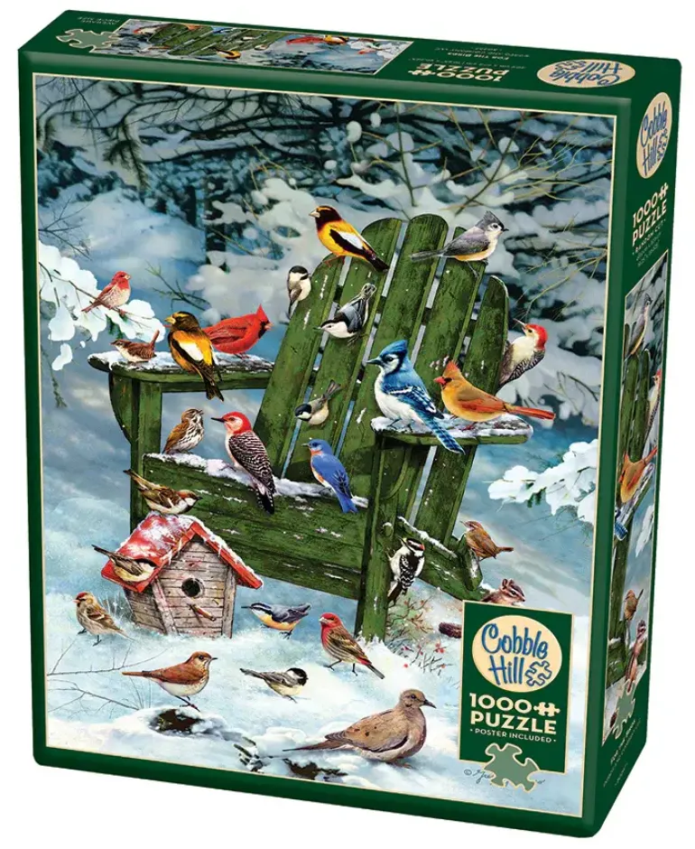 Det är en kall vinterdag och en Julgrön stol i trä står inbjudande placerad i vintersnön, prydd med trädgårdens fjäderbeklädda vänner! Nedanför stolen står en fågelholk och allt från mesar till hackspettar har samlats för att njuta av lugnet intill skogsbrynet. Ett detaljrikt pussel som erbjuder lit utmaning med de snöbeklädda landskapet, men också mycket underhållning i form av de färggranna fåglarna som man kan roa sig med att lära sig namnen på… eller kanske kan du dem alla redan?!