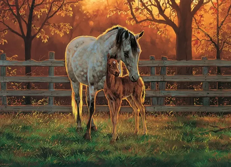 Ett sto och hennes föl har en lugn stund tillsammans i hagen. Den gyllene solen skiner genom höstträden och kastar ett vackert sken på det gröna gräset. Detta hästpussel med 500 bitar är en bra utmaning med huvudsakligen tre färger i orange, grönt och grått.