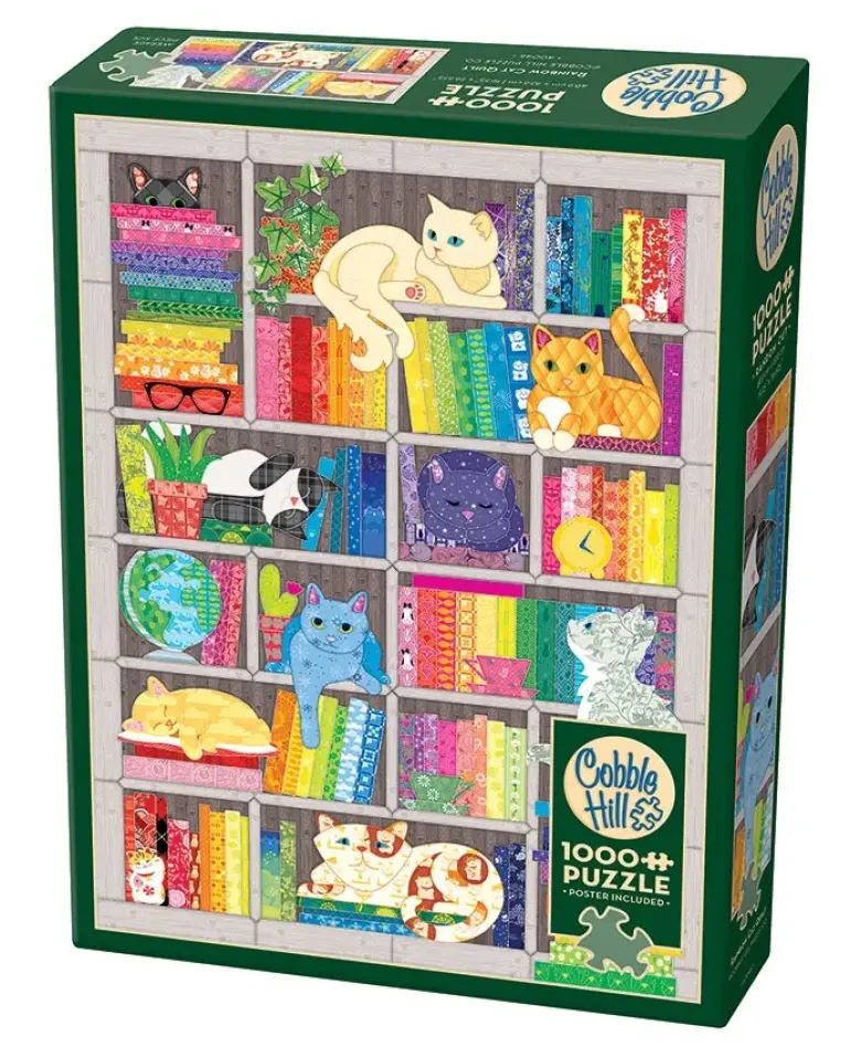 Färgglatt motiv där ett gäng katter har tagit över bokhyllan. Här samlas de och leker och vilar sig bland böcker, växter och prydnadssaker.