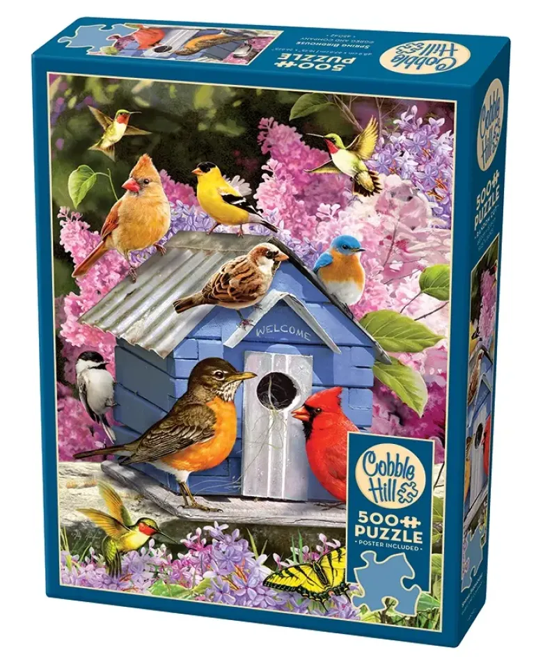 Ett fågelhus i blått är placerat på trädgårdsmuren, taket är av plåt som ger ett bra regnskydd och trivsamt smatter när det regnar. Över dörren står det ”välkommen” så att alla trädgårdens befjädrade vänner ska känna sig välkomna. Fåglar, kolibrier och fjärilar har samlats här idag, deras vackra färger blir fina kontraster till syrenträden i bakgrunden vars blommor dignar i ljust rosa och lila toner.