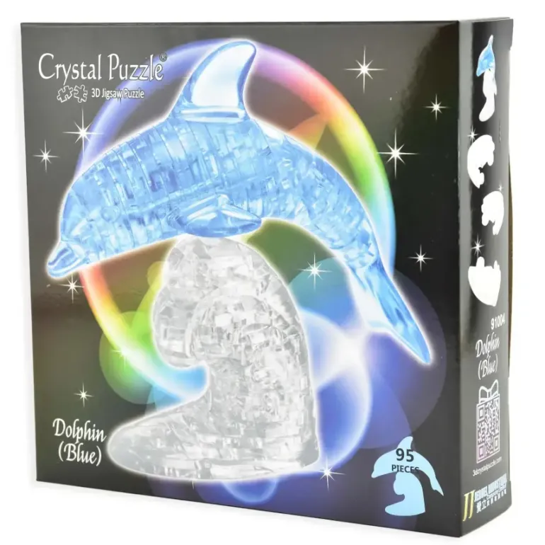 Ett 3D-Kristallpussel i form av en delfin som hoppar över en våg.