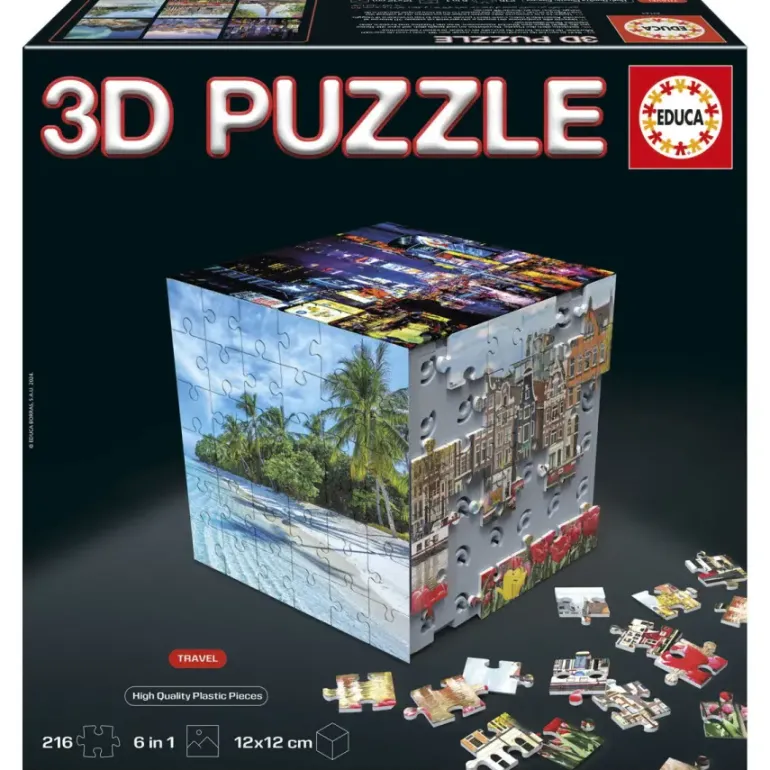Ge dig ut på en resa runt jorden med detta 3D pussel från educa. Montera kuben och fyll varje sida med olika motiv. innehåller 6 36-bitarspussel.