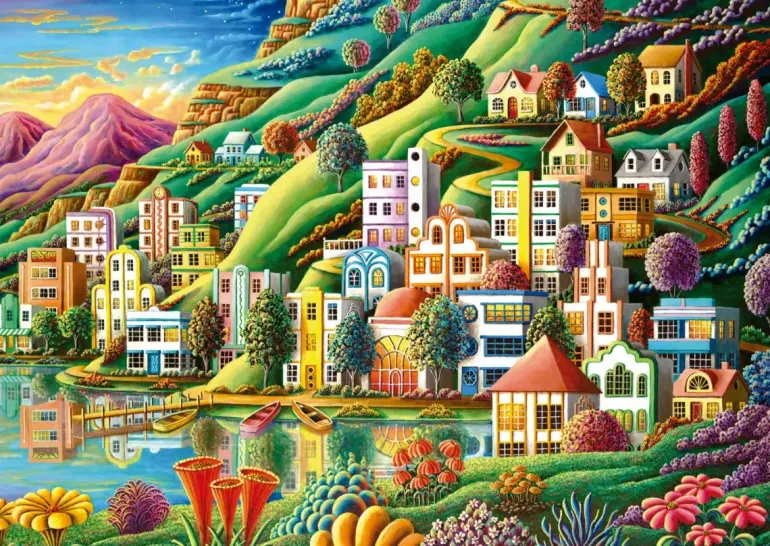 En stad med färgglad arkitektur ligger vackert belägen vid havet, omgiven av berg och gröna kullar. Här blommar blommorna, vattnet ligger spegelblankt och roddbåtarna ligger redo för en tur på havet. I bakgrunden tornar bergen upp sig och natten med sina stjärnor smyger sig fram över bergstopparna.