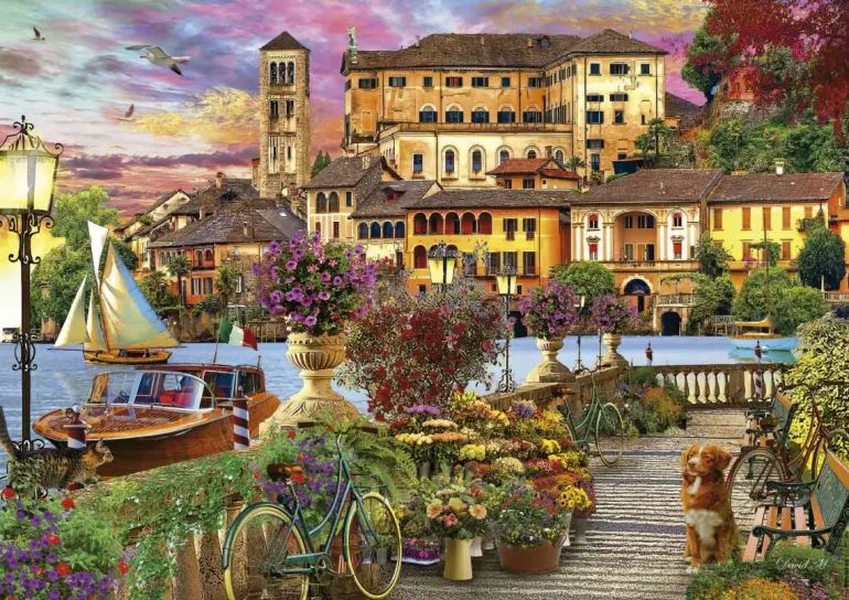 Solen är på väg ner och himlen är färgad i lila, blått, rosa och guld. Promenadvägen är kantad av gröna växter och färgsprakande blommor och leder in mot en stad med gamla stenbyggnader. Det finns bänkar att slå sig ned på för den som vill sitta en stund och blicka ut över havet. På trottoaren sitter en hund, en katt promenerar på stenräcket mot kajen, måsarna flyger i skyn och cyklar står parkerade lite här och var. I vattnet syns en motorbåt och en segelbåt i trä och längs med kajen har gatlyktorna precis tänts. Ett pusselmotiv fullt av detaljer att upptäcka.
