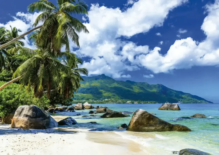 Foto av en strand i Seychellerna.