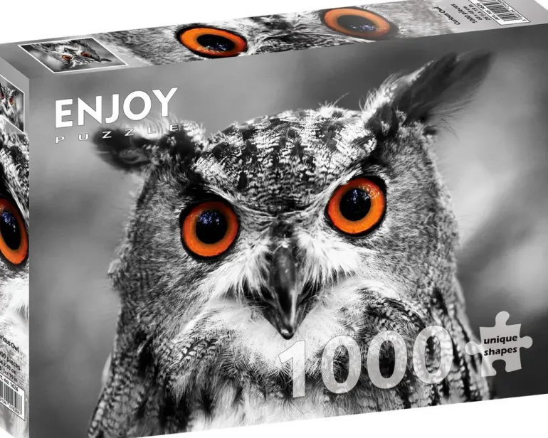 En nyfiken hornuggla stirrar rakt in i kameran med sina intensivt orangea ögon och överraskar fotografen!
