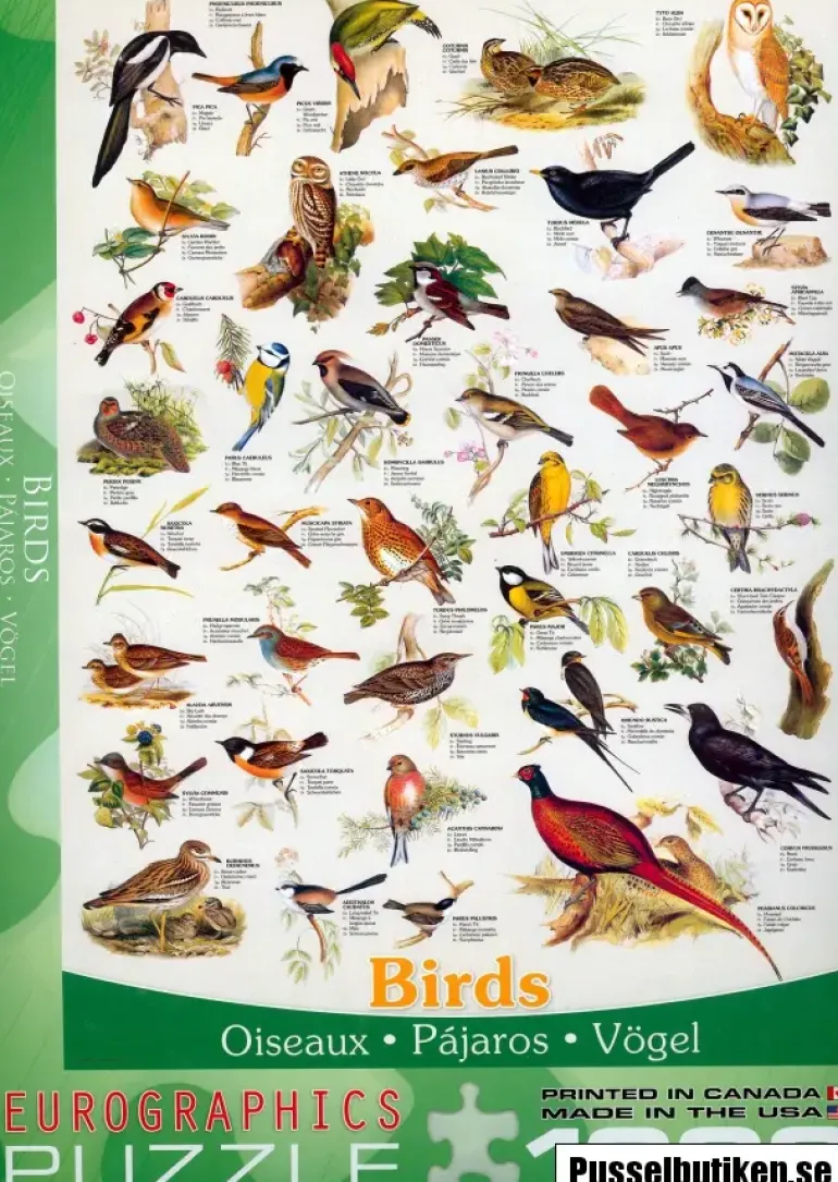 Bild över olika fåglar vanligt förekommande på fält och i trädgårdar.