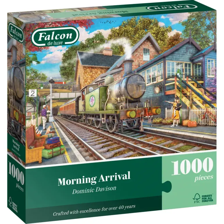 Ett tåg passerar en station i en vacker landsbygdsmiljö, med passagerare som väntar på att få stiga på och barn som är spända över att se tågen passera. Det här nostalgiskt vackra sommarmotivet är illustrerat exklusivt för Falcon av konstnären Dominic Davison.