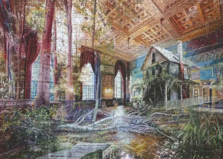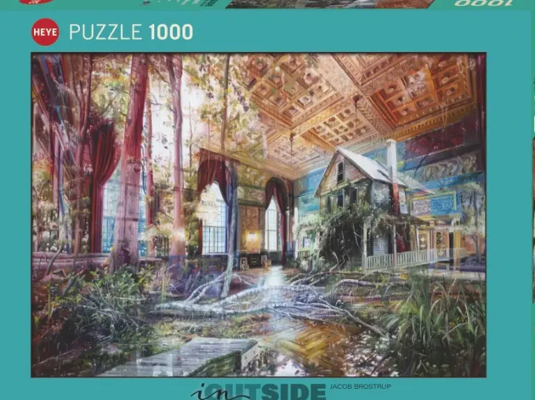 Detta pussel, målat av den danska konstnären Jacob Brostrup, kombinerar inre och yttre landskap i en drömsk, surrealistisk sammansättning.