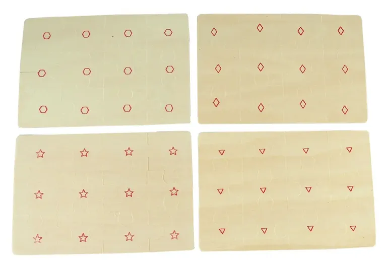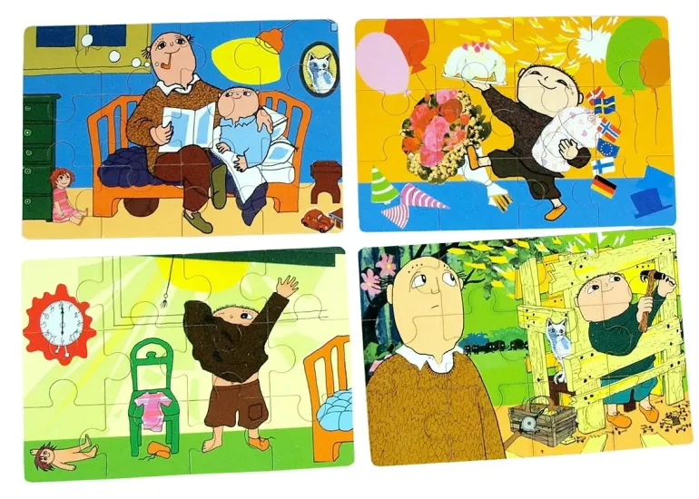 En fin trälåda som innehåller 4st träpussel på 12 bitar vardera, med motiv av Alfons Åberg.