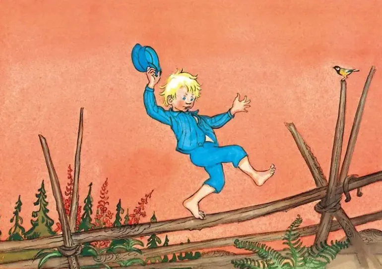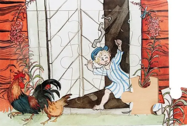 En fin trälåda som innehåller 4st träpussel på 12 bitar vardera, med motiv ur Astrid Lindgrens böcker om Emil i Lönneberga.
