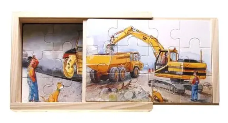 En fin trälåda som innehåller 4st träpussel på 12 bitar vardera, med motiv av Mulle Meck och hans vägmaskiner.