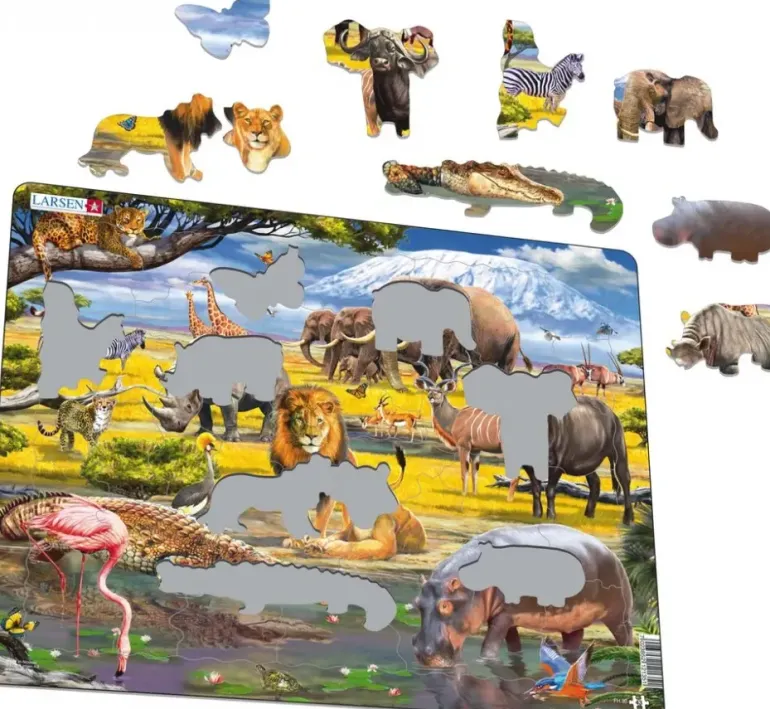 På den afrikanska savannen ser vi flera olika vilda djur. I bakgrunden ett snötäckt berg.