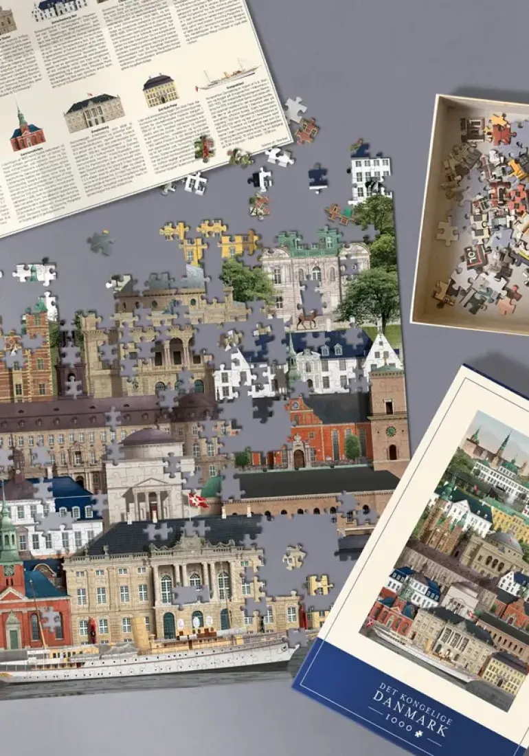 I detta 1000-bitars pussel har konstnären Martin Schwartz samlat många av de byggnader som med tiden har utgjort ramen för den danska kungafamiljen. Här hittar du en rad kyrkor och slott från hela Danmark, och i den medföljande broschyren kan du läsa mer om varje byggnads historia och dess betydelse för kungafamiljen.