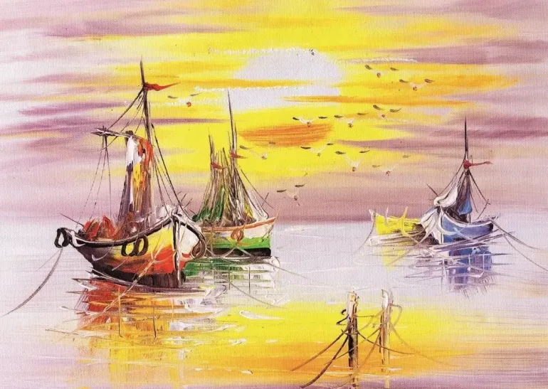 Segelbåtar i trä ligger förtöjda på ett spegelblankt hav. På himlen lyser solnedgången i varma gula och orangea färger. Motivet är illustrerat av konstnären Yung Chao Chen.