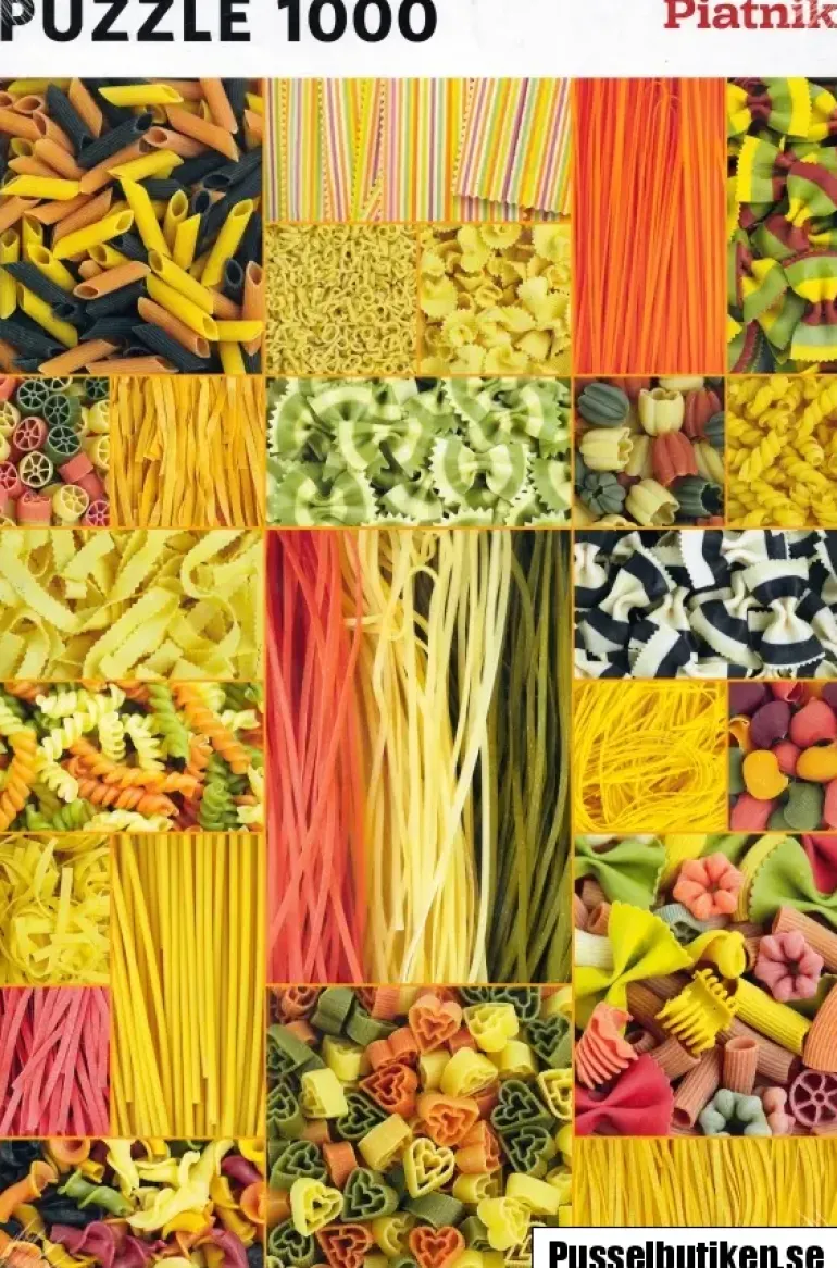 Ett pusselmotiv av olika färgglada pastasorter.