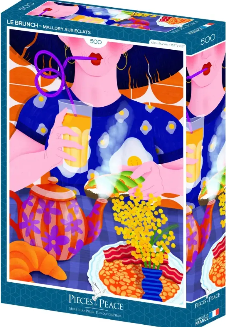 I det här färgglada pusselmotivet ser vi en person sitta vid ett dukat bord. Här finns massor av gott; bacon och brun bönor, en stor croissant, varmt té, juice och en macka med lax och avokado. På bordet står en vas med mimosablommor och personen har en rolig blå tröja på sig med stekta ägg på. Ett motiv som säkerligen bjuder på stor pusselglädje med många färgglada bitar och olika mönster.