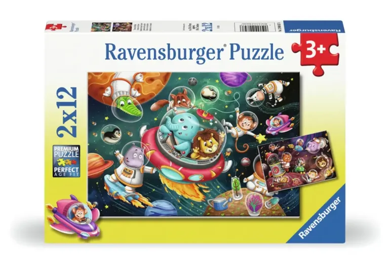 Två pussel på 12 bitar vardera, med olika motiv av söta djur på upptäcktsfärd i rymden.