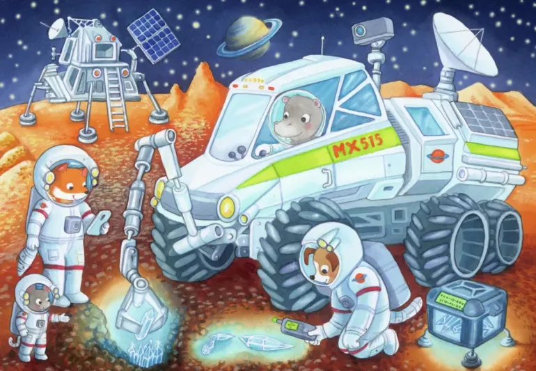 Två pussel på 24 bitar vardera med olika tecknade motiv av djur i rymden.