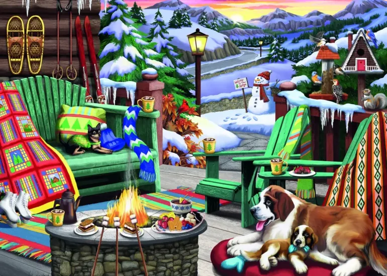 På en veranda i de snöbeklädda alperna finns en mysig sittgrupp vid en eldstad. Efter en härlig vinterdag på skidor och skridskor är det mysigt att få sätta sig ner vid elden och dricka varm choklad och grilla marshmallows. Fåglarna och ekorrarna passar också på att ta mellis vid fågelbordet och en sanktbernhardshund vilar sig tillsammans med sin lilla valp.