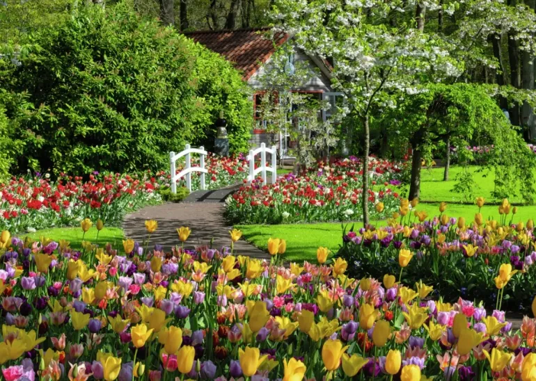 En fantastisk blomstrande trädgård med mängder av färg och gröna växter. Fotot är taget i Keukenhof trädgård i Nederländerna. Ta en promenad längs med en av de många trädgårdsgångarna och njut av mängder av tulpaner, blommande träd och pittoreskas byggnader!