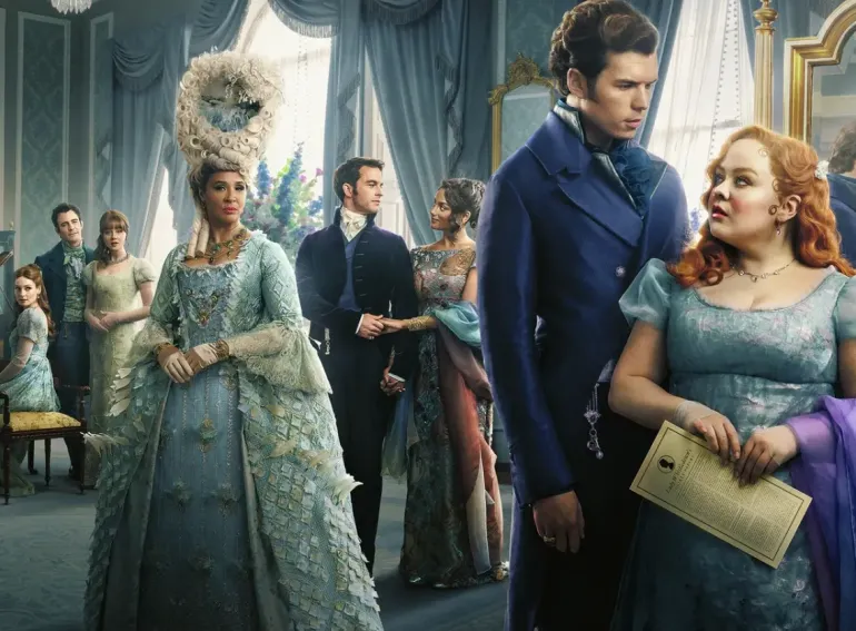 Ett motiv från TV-serien Bridgerton. Några av seriens mest framträdande karaktärer står i ett vackert, tidstypiskt dekorerat, rum i blå toner. Alla bär kläder som matchar rummets färg och i centrum står den drottningen själv med en fundersam och kanske lite missnöjd min.