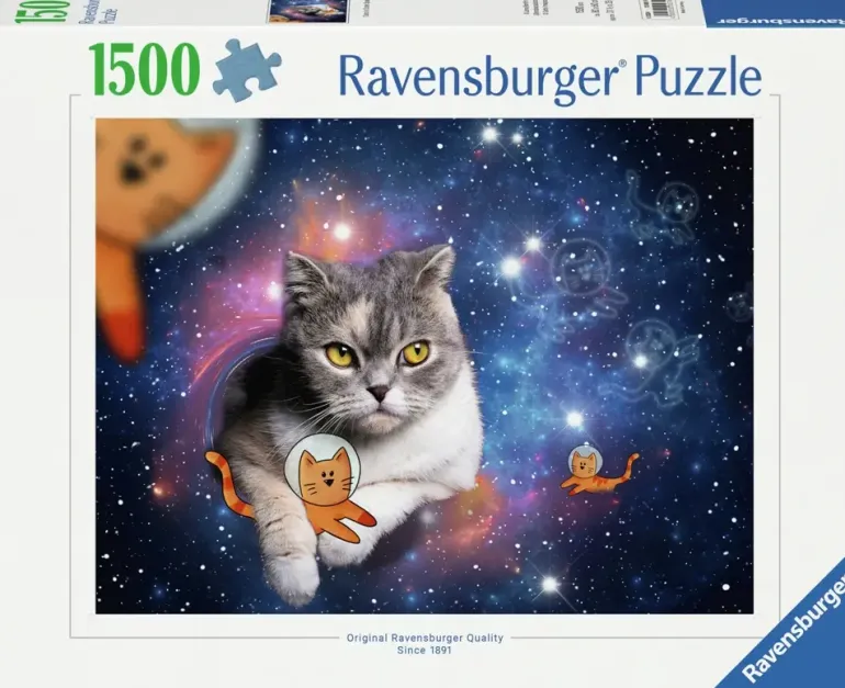 Humoristiskt motiv med en gråmillerad katt som tycks komma ur ett svart hål i rymden. Katten har även tecknade kattvänner omkring sig med astronauthjälmar på sig, och i den stjärnbeströdda galaxen syns även siluetter av astronautkatter.