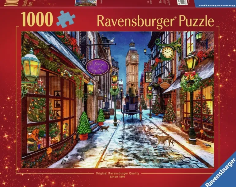 En mysig gata i London i Juletid! Alla skyltfönster och butiker är dekorerade med Julpynt, granar och belysning. Det har snöar lite men ändå är katter, hundar och duvor ute och spatserar i vinterkvällen. Någon kör en droska och i bakgrunden tornar Big Ben upp sig mot det djupblå himlavalvet.