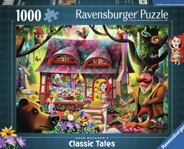 Den klassiska barnsagan Rödluvan och Vargen, illustrerad av konstnären Dean MacAdams. Rödluvan ska just knacka på dörren till Mormors hus och genom fönstret ser vi den utklädda vargen ligga nedbäddad i sängen. Utanför syns skogen och alla djur, och som tur är står jägaren redo att komma till henens undsättning!