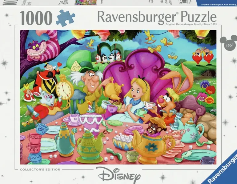 Det är tebjudning och Alice sitter i högsätet. Bordet är dukat med massor av koppar och söta tekannor. Runtomkring henne finns kända karaktärer ur filmen, både snälla och lite mindre snälla.