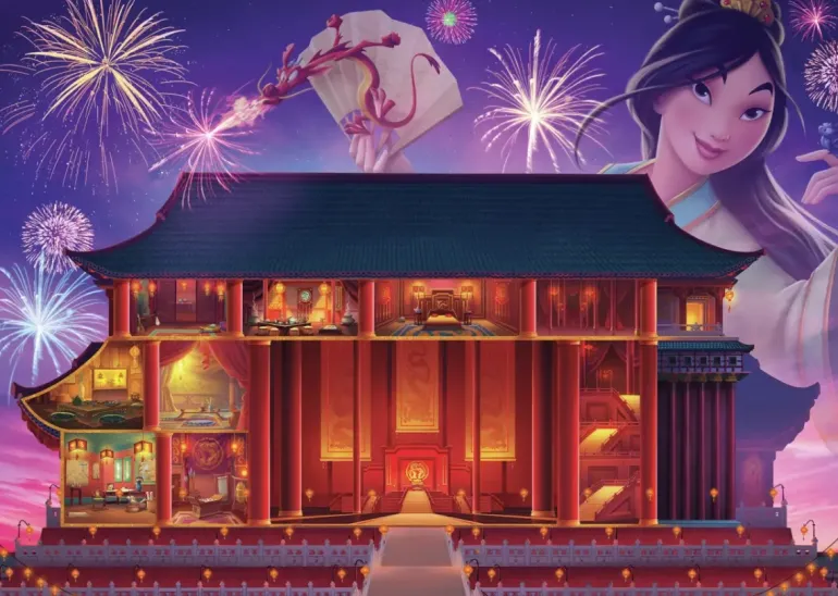 Här ser vi den praktfulla entrén med trappan som leder upp mot tronen och vi får en inblick i palatset olika rum och salar. Vi ser blad annat ett musikrum, ett vardagsrum, sovrum, spelrum och arbetsrum. I matsalen är bordet dukat och i balsalen är golvet polerat och redo för gästerna. I bakgrundens himlavalv ser vi Mulan med syrsan Cri-Kee på sitt finger och en solfjäder i handen. Draken Mushu flyger omkring och sprutar eld bland fyrverkerierna och överallt finns tända lyktor med ett varmt inbjudande sken.