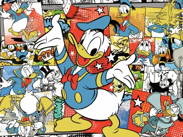 Porträtt av Disneys älskade karaktär Kalle Anka! Kalle står själv i centrum, omgiven av massor av bilder ur filmer och serietidningar han medverkat i.