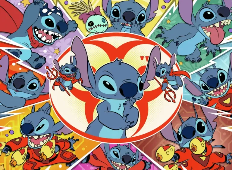 Ett fartfyllt kollage av karaktären Stitch från Disneys tecknade serie Lilo & Stitch.