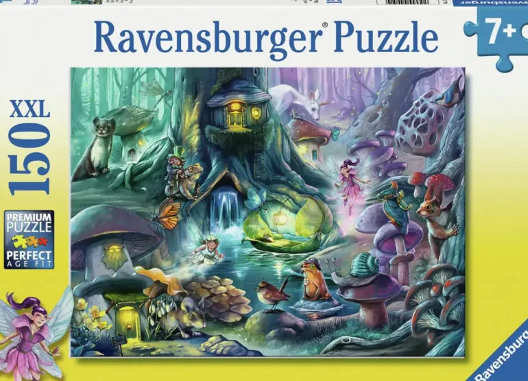 I trädälvornas stad bor djur och älvor sida vid sida. Flera av vännerna har samlats vid vattnet där ett vattenfall porlar fram och en båt av blad ligger och guppar, i aktern har den en vacker lykta som lyser upp i mörkret. Ett magiskt motiv för alla som tycker om förtrollande sagoväsen och naturen!