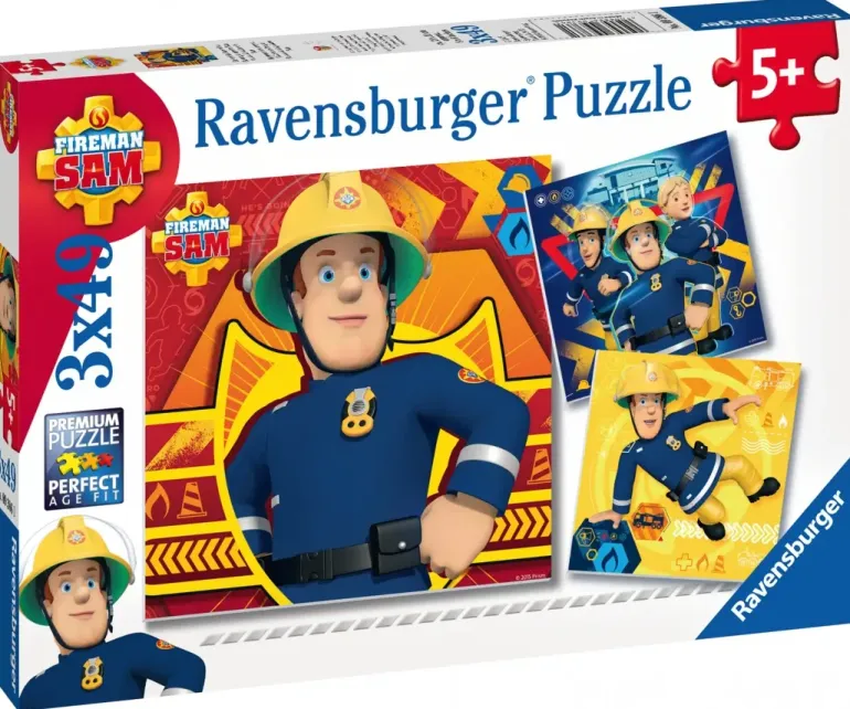 Tre pussel med olika motiv från Fireman Sam. Varje pussel består av 49 bitar. Pusselbitarna är större än traditionella pusselbitar för att förenkla pusslandet.