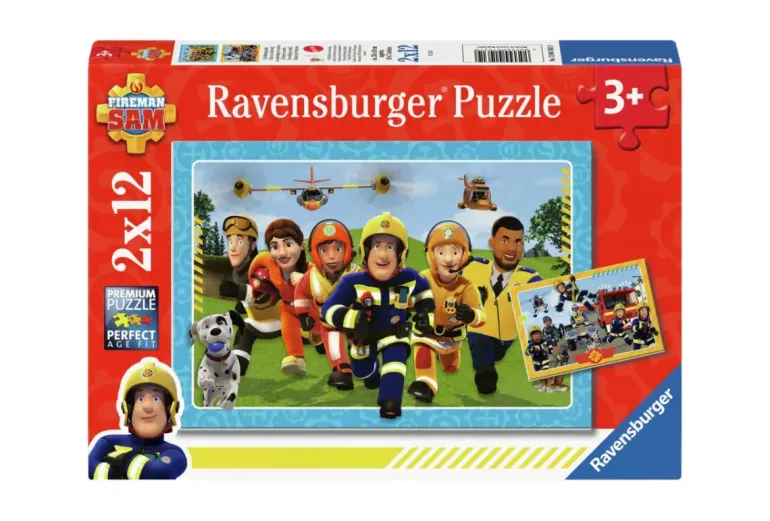 Två pussel på 12 bitar vardera, med olika motiv från den tecknade serien ”Brandman Sam”.