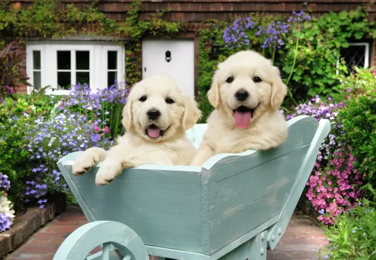 Två Golden retriever valpar sitter glatt i en skottkärra av trä. I bakgrunden skymtas ett hus och en trädgård full av rosa och lila blommor.