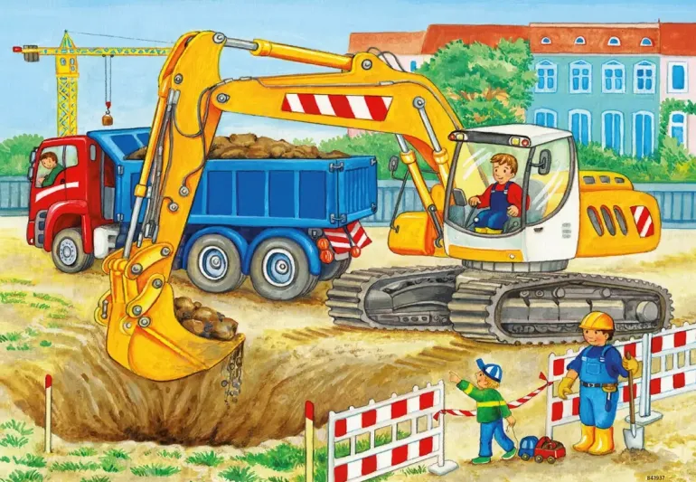 Två pussel på 12 bitar vardera, med olika motiv av tunga fordon i arbete.
