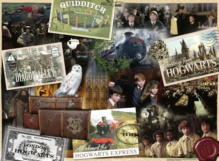 Ett pusselkollage av bilder ur de älskade filmerna om Harry Potter och hans vänner på Hogwarts.