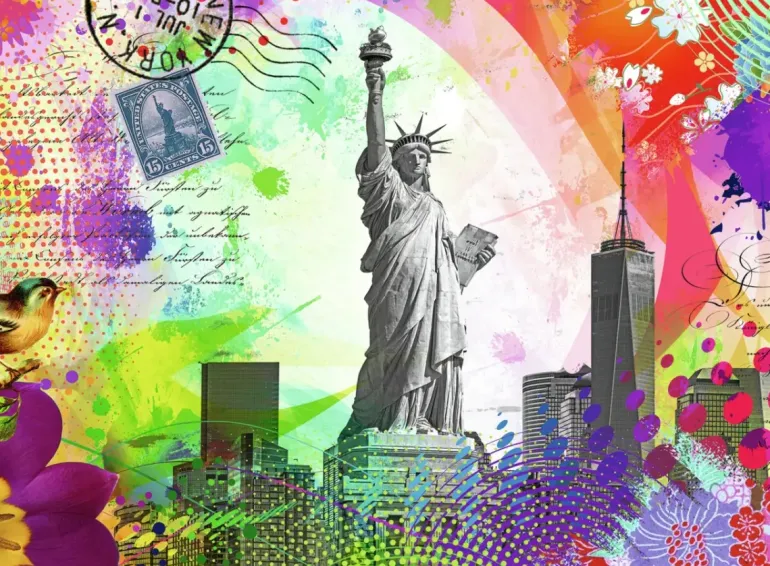 Vykort från New York med motiv av frihetsgudinnan och andra kända byggnader i svartvitt. Runt kanterna syns en färgexplosion med olika mönster, blommor och en liten fågel.